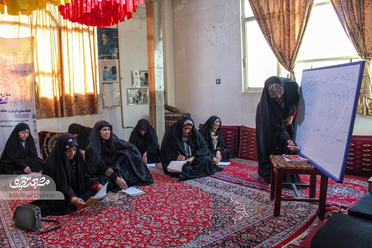 کلاس، به دو گروه تقسیم شده است. یک گروه که پیشتر هستند، از ساعت ۱۴ تا ۱۵، درس جدید را یاد میگیرند. نوبت گروه دوم، از ساعت۱۵ تا ۱۶:۳۰ است. در این نوددقیقه، تکالیفشان را تحویل میدهند، روخوانی میکنند و املا مینویسند. در هر کدام از اینها ضعف داشته باشند، سرمشق جدید داده نمیشود و باید با تمرین بیشتر، آمادگیشان را برای درس تازه، نشان بدهند. این رویهای است که فاطمهسیما باقری، برای یادگیری سوادآموزان کلاس، درنظر گرفته است. او از سال۱۳۹۶ که مسئولیت معاونت آموزشی پایگاه بسیج ولیعصر را برعهده دارد، کلاس سوادآموزی را برای بالابردن سطح سواد بانوان محله رده، با دو نفر راهاندازی کرد. در این مدت، براساس علاقه و توانایی ذاتیاش در تدریس، به تجربه و شیوههایی رسیده که کلاسش را در محله زبانزد کرده است و اهالی، خود مبلّغ کلاسهای رایگان او شدهاند؛ «خانمهای کلاس از سیوهشتساله هستند تا بالای شصتسال. اگر ببینم با روشهای معمولی یاد نمیگیرند، نقاشی میکِشم و با نمادسازی، حروف را یادشان میدهم. مثلا جوجه میشود، نماد حرف ج، سیب میشود برای حرف س و….» این بانوی پنجاهوسهساله که خود تا سوم راهنمایی درس خوانده است، با همین روشهای بهظاهر ساده و ضمیمهکردن صبر و خوشخلقی، دستکم به سی بانوی محله، سواد خواندن و نوشتن و قرائت قرآن را هدیه داده است.